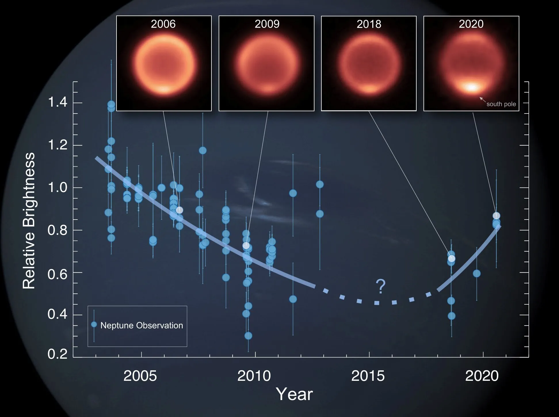 در ادامه دانشمندان از کشف گرم شدن چشمگیر قطب جنوبی نپتون طی دو سال آخر رصدخای خود شگفت زده شدند. این دادهها افزایش 11 درجهای دما را از سال 2018 تا 2020 نشان داد. اگرچه گردابهی گرم قطبی نپتون سالهاست که شناخته شده است اما تا کنون این گرمایش سریع هرگز در سیاره مشاهده نشده است.