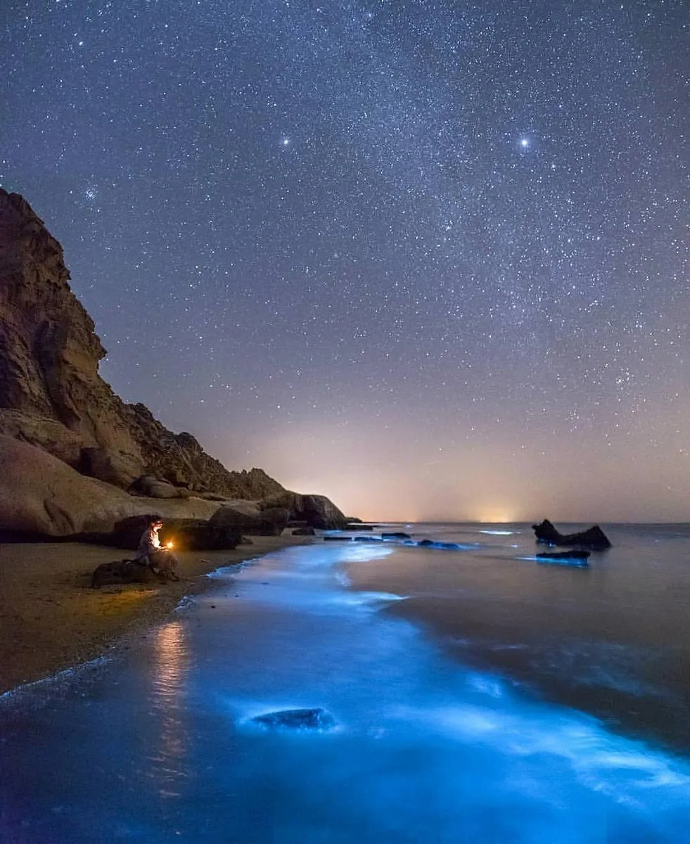 اگر بخواهید تمام فضا را در یک قاب قرار دهید، سواحل خلیج فارس و دریای عمان، تجربهای بینظیر ارائه میدهند. «زیستتابی» یا «بیولومینسانس» (Bioluminescence)، پدیدهای هیجانانگیز است که پس از شب، هنگامی که پلانکتونها میدرخشند و سواحل را با نور آبی خود روشن میکنند، اتفاق میافتد. سواحل هرمزگان و سواحل چابهار در فصل زمستان شاهد این پدیدهی دیدنی هستند که به «شفق قطبی دریایی» هم معروف است. ثبت این پدیده با ستارههای آسمان، میتواند رویایی در فهرست مورد نیاز عکاسان آسمان شب باشد.