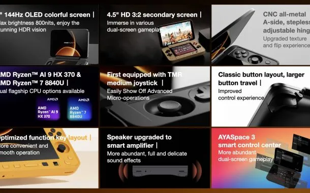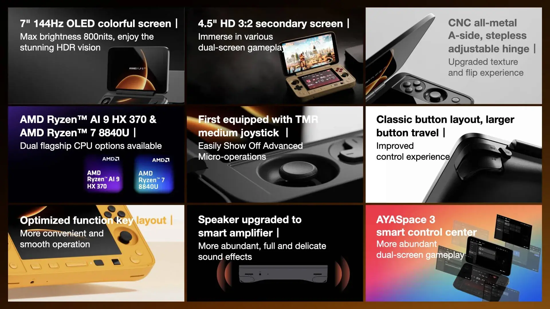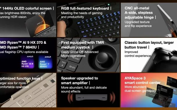 این دستگاه از دو پردازندهی پرچمدار AMD Ryzen AI 9 HX 370 و AMD Ryzen 7 8840U قدرت میگیرد و برای اولین بار از جویاستیک الکترومغناطیسی TMR با اندازهی متوسط استفاده میکند. دکمههای بزرگتر و چینش جدید کلیدهای عملکرد در موقعیت پایینتر، دقت و راحتی کار را افزایش دادهاند. از نظر صدا، یک تقویتکنندهی هوشمند باعث صدایی پرحجمتر و شفافتر شده است. وجود دو درگاه USB4 نیز انتقال داده و اتصال لوازم جانبی را آسانتر میکند. اپلیکیشن هوشمند AYA Space 3 نیز قابلیتهای گسترده بازی دوصفحهای را فعال کرده و تجربهای در سطح پرچمداران این حوزه را ارائه میدهد.