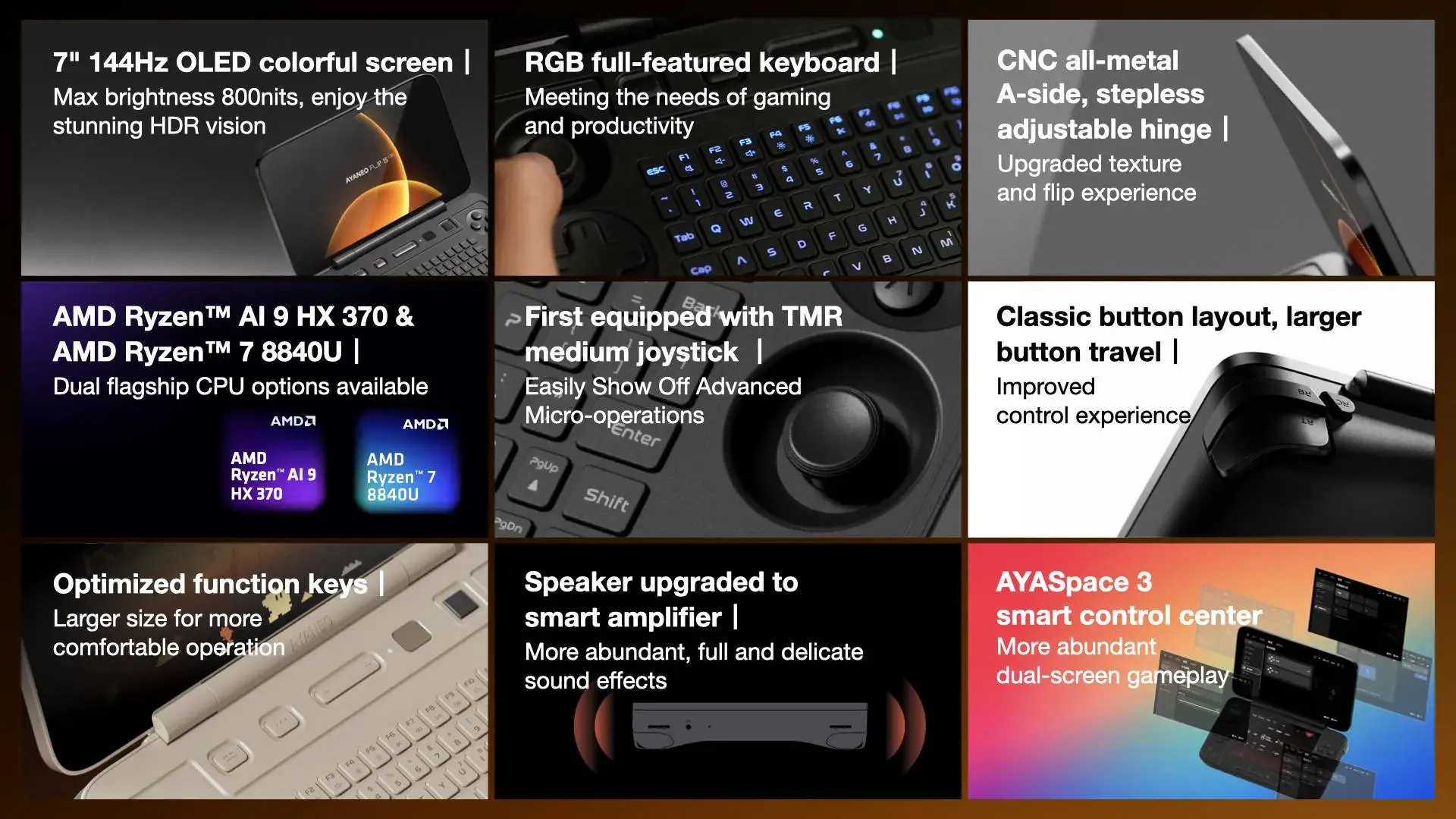 کاربران میتوانند بین دو پردازندهی پرچمدار AMD Ryzen AI 9 HX 370 و 8840U انتخاب کنند. همچنین جویاستیک الکترومغناطیسی TMR برای کنترل دقیق و مناسب حرکات ظریف در بازیها روی این کنسول سوار شده است. اسپیکرهای مجهز به تقویتکنندهی هوشمند، صدایی غنی و دلنشین ایجاد میکنند و با استفاده از AYA Space 3، مدیریت دستگاه آسانتر شده است. این مدل علاوه بر اجرای روان بازیهای بزرگ، میتواند نیازهای کاری سبک را هم برطرف کند.