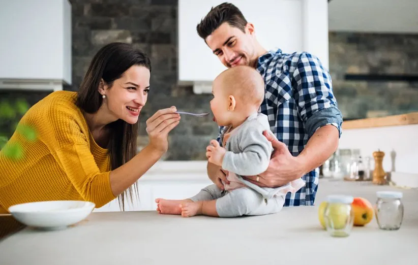 وقتی کودک بتواند با حمایت شما بنشیند و به غذاهای جامدی که دیگران میخورند علاقهمند باشد، برای شروع تغذیهی تکمیلی آماده است. در ابتدا فقط یک یا دو بار در روز به کودک خود یک یا دو قاشق غذاخوری غلات رقیقشده یا غذاهای پورهشده بدهید. مطمئنترین راه برای معرفی غذاهای جدید به کودک این است که خودتان غذای او را درست کنید تا دقیقا بدانید که چه چیزی در آن وجود دارد.