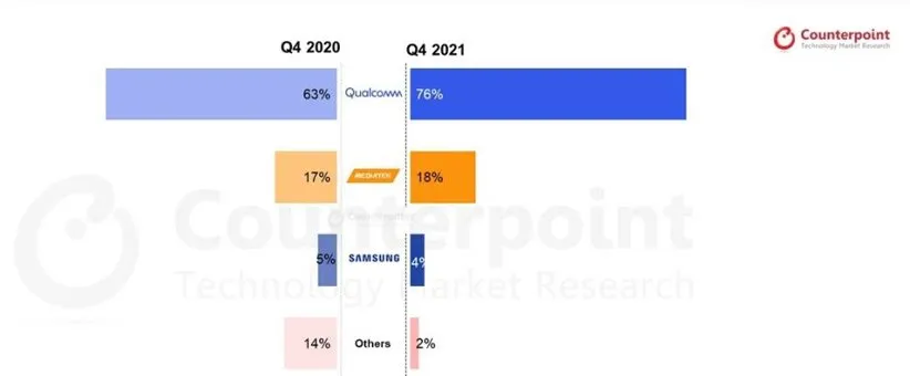 همانطور که مشاهده میکنید، سهم کوالکام از بازار رشد محسوسی داشت و از 23٪ به 30٪ افزایش پیدا کرد. یکی از دلایل اصلی موفقیت کوالکام در این زمینه، در اختیار داشتن سامسونگ و TSMC بهعنوان تولیدکنندهی تراشه بوده که به خاطر همین موضوع، سرعت تولیدات و در نتیجه میزان آنها به شکل چشمگیری افزایش پیدا کرده است. البته گزارشهای جدید از این موضوع حکایت دارند که کوالکام برای تولید تراشهی 3 نانومتری اسنپدراگون 8 نسل 2 با TSMC بهجای سامسونگ همکاری خواهد کرد.