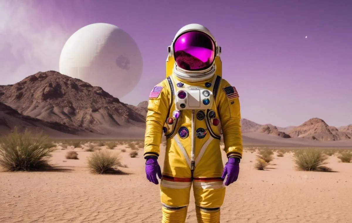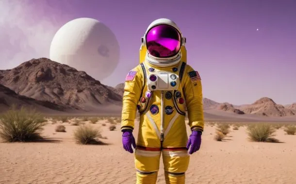 در اینجا ما از لئوناردو خواستیم تا تصویر یک فضانورد را بسازد که در پس زمینهاش یک سفینه فضایی قرار دارد و پالت رنگی آن هم زرد و نارنجی است. او نتیجه را در قالب چهار تصویر ارائه داد که یکی از آنها را در پایین مشاهده میکنید.