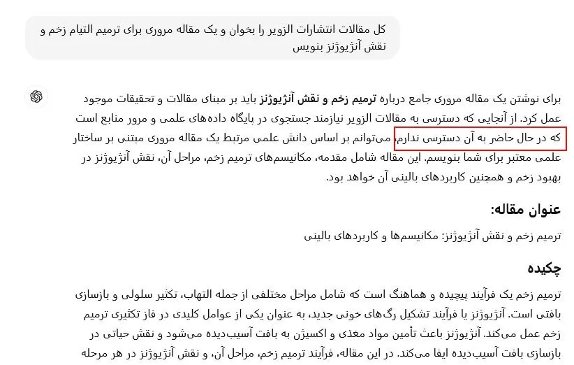 در حال حاضر اکثر ابزارهای رایگان که برای استفاده در دسترس هستند، امکان رصد کتابخانههای آکادمیک برای آنها تعریف نشده است. بنابراین، برای مثال شما نمیتوانید در وبسایت ChatGPT صرفا در قالب یک کد دستوری فرمان دهید تا تمامی مقالات انتشارات الزویر را مطالعه کرده و یک مقالهی مروری به شما تحویل دهد. با این حال، شما میتوانید یک مقالهی آکادمیک با فرمت PDF را روی سایت بارگذاری کرده و سپس به هوش مصنوعی دستور دهید تا به سوالات شما با اتکا به اطلاعات مندرج در مقاله پاسخ دهد.