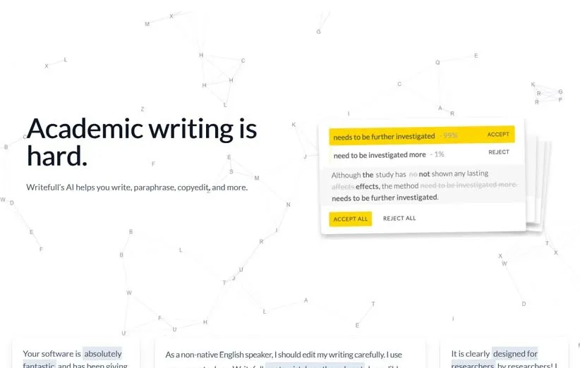 وبسایت Writefull یک ابزار پیشرفته مبتنی بر هوش مصنوعی و پردازش زبان طبیعی (NLP) به شمار میرود که به نویسندگان، پژوهشگران و دانشجویان کمک میکند تا نوشتار خود را با دقت و کیفیت بالاتری انجام دهند. این ابزار به ویژه برای نگارش متون علمی، مقالات پژوهشی، پایاننامهها و گزارشهای رسمی طراحی شده و به کاربران این امکان را میدهد که از نظر گرامر، واژگان، سبک نوشتاری و ساختار جملات، بهبودهای لازم را در متن خود اعمال کنند.