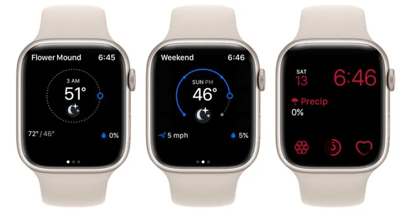 پس از باز کردن برنامه، میتوانید دمای فعلی بیرون را ببینید. فقط Digital Crown را بچرخانید تا پیشبینی 24 ساعت آینده را هم ببینید. حال انگشت خود را به چپ بکشید تا پیشبینی آخر هفته را ببینید. صفحه نهایی زمان طلوع و غروب خورشید را برای مکان شما نشان میدهد. فقط یک نمونه وجود دارد که شانس بارش را برای مکان شما نشان میدهد.