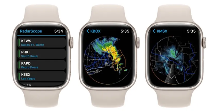 هفتمین اپلیکیشن هواشناسی در اپل واچ RadarScope نام دارد. بهخصوص اگر در منطقهای با آب و هوای سخت زندگی میکنید، RadarScope باید در اپل واچ شما باشد. این برنامه شامل همه چیز از جمله نمایش رادار از مکانهای مختلف در ایالات متحده، کانادا و مکانهای دیگر است.