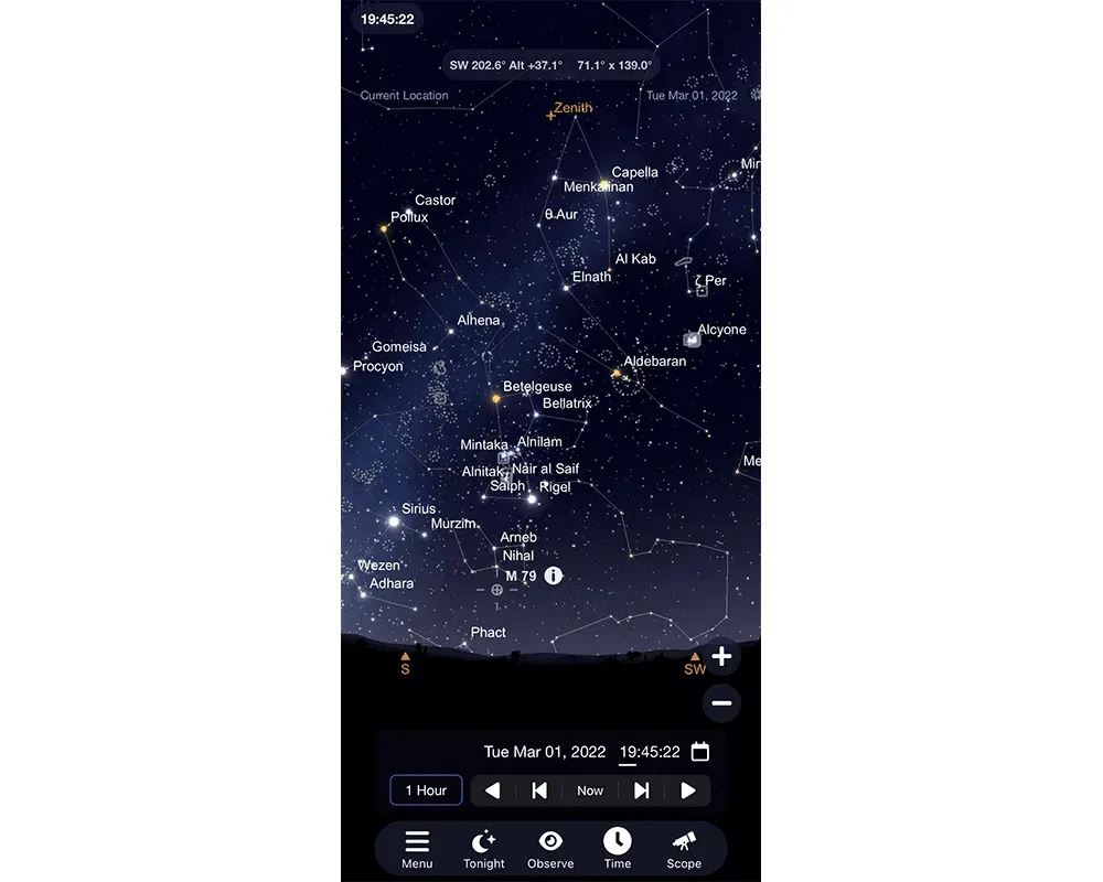یکی از زیباترین، جذابترین و بهترین اپلیکیشنهای نجوم اپلیکیشن Star Walk به شمار میرود که حالت سفر در زمان بسیار کاربردی و مفیدی نیز دارد. شما باید ساعت را در گوشهی بالا و سمت راست لمس کرده، پس یک انگشت را از کنار صفحه به سمت بالا کشیده و آسمان شب به سرعت به جلو میرود، آن هم با هر سرعتی که دلتان بخواهد! این نرمافزار برای برنامهریزی جلسات رصد طولانی و در آیندهی نزدیک بسیار مناسب بوده و مانند صفحه Sky Live، شما میتوانید تنها با یک نگاه، زمان طلوع و تنظیم سیارات و ماه را تماشا کنید.