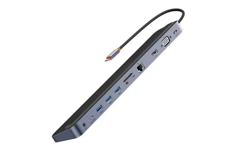 کابل هاب تنها ۲۵ سانتیمتر بوده و دارای یک کانکتور USB Type-C به عنوان رابط برای اتصال به لپتاپ است. از طرفی، یک پورت از ۱۱ درگاه دارای ویژگی شارژ با قابلیت PD با حداکثر توان ۱۰۰ وات و سرعت انتقال اطلاعات ۵ گیگابیت بر ثانیه از طریق پورت USB Type-C است. علاوه بر پورتهای USB، دو عدد درگاه کارت حافظه، یکی برای Micro SD و دیگری برای SD در این هاب تعبیه شده است. از طرفی، یک درگاه صدا یا همان جک ۳.۵ میلیمتری و یک عدد درگاه AUX هم در این دستگاه برای اتصال هدفون و دستگاههای دارای خروجی صدا دیده میشود.