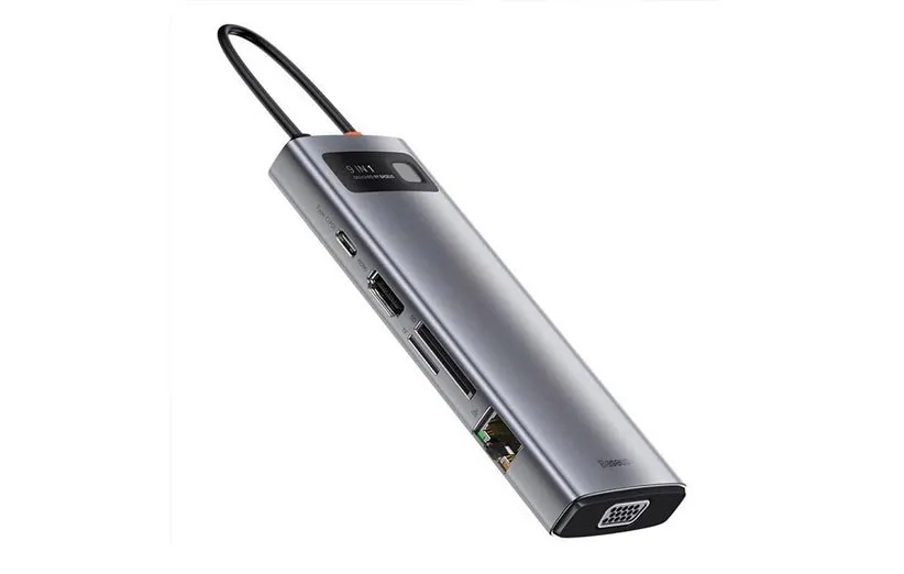 هاب 9 پورت usb-c بیسوس مدل CAHUB-CU0G یکی دیگر از بهترین گزینهها برای خرید محسوب میشود. سه عدد پورت USB 3.0، یک پورت USB Type-C، یک پورت HDMI، دو درگاه کارت حافظه Micro SD، یک درگاه VGA و یک درگاه RJ45 در این دستگاه تعبیه شده است.