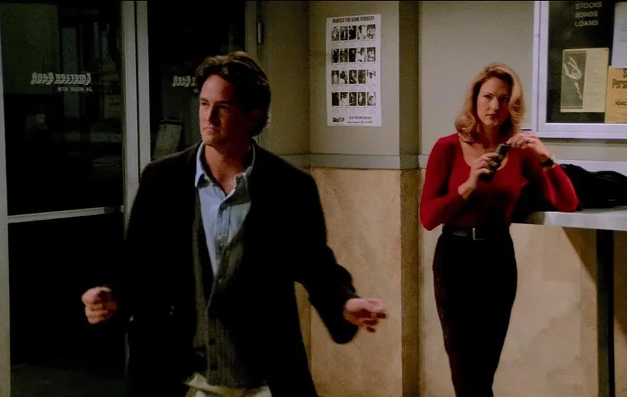 یکی از بامزهترین و البته خوشگلترین و بهظاهر سرحالترین لحظات متیو پری در همین فصلی است که با رئیس ریچل، جوآنا ارتباط برقرار میکند. این لحظه که در تصویر میبینید جایی است که جوآنا از اتاقش در محل کارش رفته است و چندلر را به دستبندی به دستش تنها گذاشته است تا برود و برگردد و چندلر همچنان آنجا باشد. غیبت جوآنا طولانی میشود و چندلر با اینکه به ریچل قول داده بود رابطهاش را با جوآنا قطع میکند، مجبور میشود برای آنکه از آن وضعیت نجات پیدا کند، از اتاق جوآنا با ریچل تماس بگیرد که بیاید و دستش را باز کند. ریچل قبول نمیکند چون میگوید اگر جوآنا بفهمد او این کار را کرده است، اخراجش میکند.