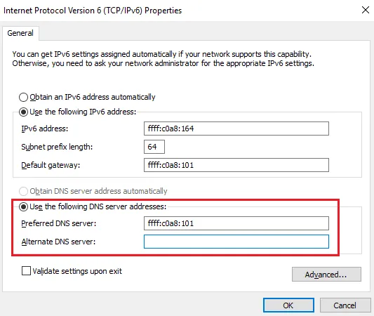 - گزینه Use the following DNS server addresses را انتخاب کنید و آدرسهای DNS موردنظر را وارد کنید.