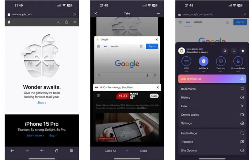 با وجود این که Opera به اندازه گوگل کروم یا فایر فاکس پرطرفدار نیست، این نرم افزار را میتوان یکی دیگر از انتخابهای جایگزین برای کاربران آیفون تلقی کرد. این برنامه دارای مسدودکنندهی تبلیغات در بدنهی داخلی خود است. بنابراین، شما نیاز به نصب افزونه از این بابت ندارید.