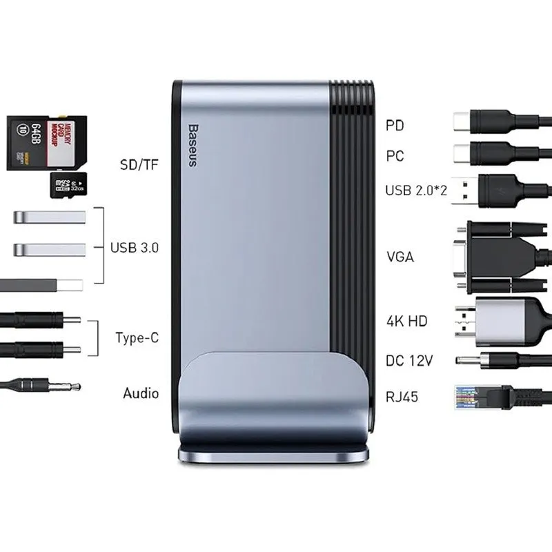 اگر به دنبال خرید یک هاب با طیف گستردهای از پورتها برای لپتاپهای اپلی خود هستید، شما میتوانید هاب 16 پورت باسئوس مدل Working Station BG را به عنوان یکی از لوازم جانبی مکبوک ایر M1 یا لوازم جانبی مکبوک ایر 2020 برای خرید در نظر بگیرید. این محصول که تقریباً 400 گرم وزن دارد، از آلیاژ آلومینیوم تولید شده تا در برابر ضربات مقاوم باشد. البته به دلیل وزن و اندازهی بزرگش جابهجایی آن خیلی راحت نیست. این محصول مجهز به ۱۶ پورت خروجی (HDMIx۱ ، USB۳.۰x۳ ، USB۲.۰x۲ ، RJ۴۵ ، USB-Cx۴ ، TF ، SD ، AUX ، VGAx۱ و DC) است و قابلیت اتصال هارد، فن و دیگر موارد را نیز دارد. همچنین این هاب از سرعت انتقال داده 5 گیگابایت بر ثانیه نیز پشتیبانی میکند تا مشکلی از این بابت نیز نداشته باشید. یک چراغ آبی نیز روی بدنه این هاب تعبیه شده که جلوه بسیار زیبایی به آن داده است. این محصول از وضوح تصویر 4K HD و VGA نیز پشتیبانی میکند.