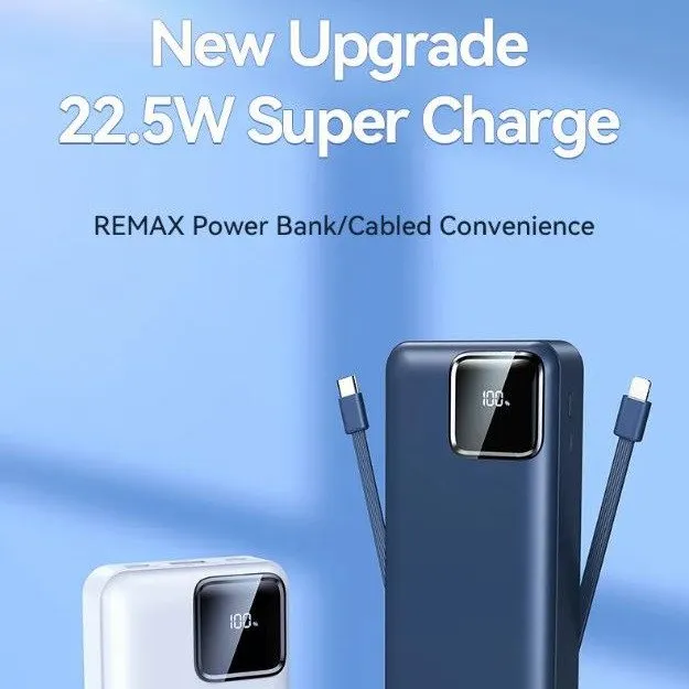 این پاوربانک ریمکس از نشانگر LED و نمایشگر دیجیتال روی بدنهاش بهره میبرد که اطلاعاتی در مورد وضعیت شارژ آن در اختیار کاربران قرار میدهد. همچنین ریمکس یک چراغ قوه قدرتمند نیز روی بدنهی این محصول خود طراحی کرده تا در مواقع ضروری بتوانید از آن بهره ببرید. سه پورت USB-A که یکی از آنها با توان 22.5 وات و با پروتکل QC، یک پورت USB-C با حداکثر توان خروجی 20 وات و با پروتکل PD و یک پورت میکرو USB نیز برای این محصول در نظر گرفته شده است. پورت USB-C این محصول هم به صورت ورودی و هم به صورت خروجی قابلیت استفاده دارد و خود پاوربانک را با توان 18 وات و کابل فست شارژ میتواند در مدت زمان حدود 16 ساعت به طور کامل شارژ کند. یک بند نیز برای حمل و نقل راحتتر این محصول روی بدنهاش تعبیه شده است.
