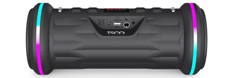 لازم به ذکر است که با افزایش ولوم صدا به بیش از 70 درصد، کیفیت صدای خروجی به طور قابل توجهی کاهش مییابد. از نظر تنوع پورتها، این اسپیکر قابلیتهای متعددی ارائه میدهد؛ از جمله جک هدفون، پورت USB، جک 3.5 میلیمتری برای میکروفون و پورت microUSB برای شارژ. خروجی صدای اسپیکر تسکو 23415 در حدود 18 وات است و نورپردازی جذابی نیز دارد.