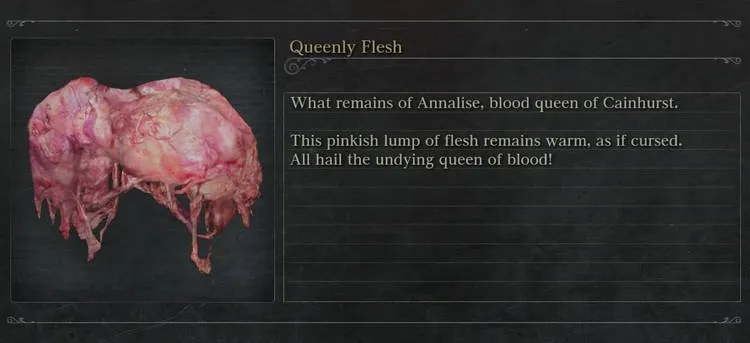 بله در انتها او تنها روی زمین به طرز عجیبی میلولد. «نامیرا بودنت الان به چه دردی میخورد! در این وضعیت اسفبارت دردسر درست کن! تکه پاره شده و درهمشکسته، با تمام آنچه که باید داخل باشد اما بیرون ریخته تا تمام دنیا شاهد آن باشد!» – آلفرد. تن شهبانووار (Queenly Flesh)، در توضیح تکه گوشتی که شخصیت شکارچی میتواند از بازمانده آنالیس دریافت کند نوشته شده: