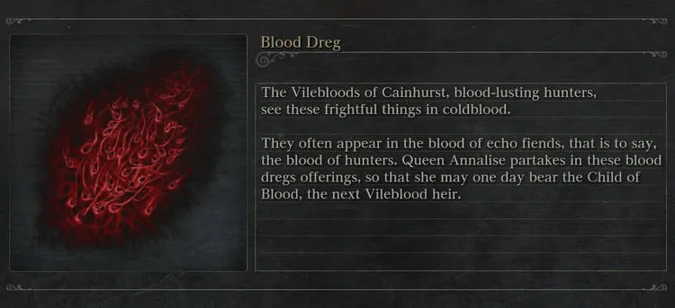 بدخونها شب از قلعه خارج شده و به دنبال شکار موجودات قدرتمند میروند تا آنها را اسیر کرده و به نزد ملکهشان بیاورند. در اینجاست که شکارچیان به شکار موردعلاقه بدخونها تبدیل میشوند. خونمانده آیتمی است که شکارچی بازیکن میتواند به دست بیاورد اگر به رون Corruption مجهز باشد. در توضیح این آیتم آمده است: «بدخونهای کینهرست، شکارچیان تشنه به خون، این چیزهای ترسناک را با خونسردی نظاره میکنند. آنها اغلب در خون echo fiendها پیدا میشوند، بهعبارتدیگر خون شکارچیان. ملکه آنالیس در مراسم تقدیم این خونمانده ها شرکت میکند تا بتواند روزی با فرزند خون آبستن شود، وارث جدید بدخون.» به تصویر آیتم خونمانده نگاه کنید. به آن چیزهای کوچکی که به نظر میرسد در درونش میلولند دقت کنید. آنها شبیه اسپرم هستند اینطور نیست؟