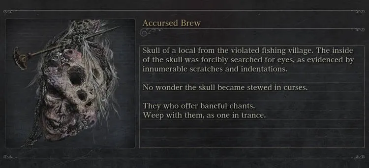 اگر بازیکن Milkweed Rune بر تن داشته باشد، کشیش به او جمجمهای به نام Accursed Brew میدهد که در توضیحات آن نوشته شده: «جمجمهای متعلق به یکی از ساکنین دهکده ماهیگیری مورد تجاوز قرار گرفته. باتوجهبه تعداد بیشمار خراشها و تورفتگیهای که در بخش درونی جمجمه دیده میشود در آن به دنبال دیدگان قربانی گشته شده است.» هر اتفاقی که در فیشینگ هملت افتاده قطعاً به کوز (Kos) مرتبط است. فرهمندی که در انتهای این بخش با آن مواجه میشویم.