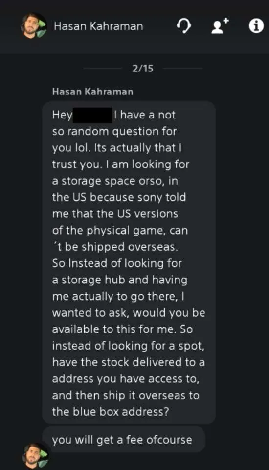 در زمانی دیگر، او از یکی از اعضای گروه خواست تا با ذخیرهی برخی از نسخههای فیزیکی نهایی بازی در ایالات متحده، به عنوان شریک حملونقل او عمل کند تا نیازی به سفر او از هلند به ایالات متحده، وجود نداشته باشد. در واقع او اعلام کرده بود که سونی نسخههای بازی را به قارههای دیگر ارسال نخواهد کرد. او پیشنهاد داد که برای این کار 1500 دلار به طرفدار میپردازد. او همچنین بیان کرد که شرایطی را فراهم میکند تا بتوانند با سونی مکاتبه کنند تا نسخهها را به آدرسی خاص ارسال کنند و در نهایت آنها با پست به دست قهرمان برسانند. در نهایت چند روز پس از ارسال فرمی از سوی سونی به طرفدار، قهرمان این قرارداد عجیب و غریب را فسخ کرد.