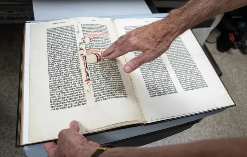 صفحهای از انجیل اصلی گوتنبرگ (1450-1455 بعد از میلاد) توسط پرتوهای سنکروترون SLAC اسکن میشود.