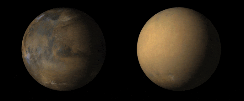 طوفان شن در مریخ پدیدهای عادی است. بیشتر آنها در محدودهی کوچکی اتفاق میافتند اما یک یا دو بار در هر دهه، برخی از طوفانها، اثری دومینو-مانند ایجاد میکنند و با برخاستن شن کافی، سطح مریخ پوشیده میشود؛ پدیدهای که با نام «رویداد گرد و غبار محاصرهی سیاره» شناخته میشود. این تصویر توسط MARCI در تابستان 2018 و زمانی ثبت شد که طوفان مریخ را دربر گرفته بود و صفحات خورشیدی مریخنورد فرصت (Opportunity) را پوشاند و در نهایت منجر به پایان مأموریت شد.