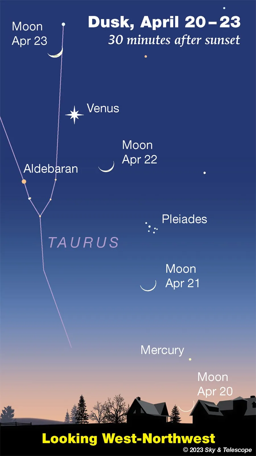 طبق اعلام Sky and Telescope در این شب پس از تاریکی هوا، سیارهی زهره، هلال ماه و ستارهی درخشان «دبران» (Aldebaran) در سمت غرب آسمان یک مثلث تقریبا متساویالساقین دیدنی تشکیل میدهند. ضلعهای بلند این مثلث حدود 8 درجه طول دارند.