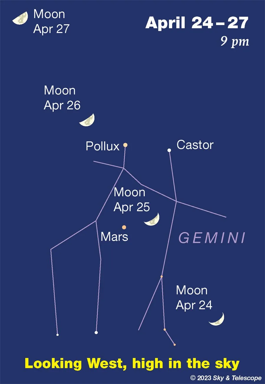 هلال ماه که ضخامت آن نسبت به شبهای قبل باز هم افزایش یافته است، در این شب، در صورت فلکی «دوپیکر» (Gemini) و کنار مریخ دیده میشود.
