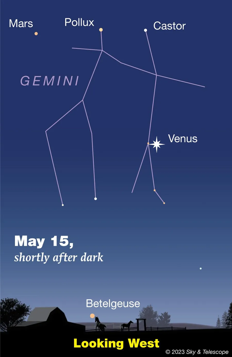 زهره با قدر 4.3- از کنار سرپیشین و سرپسین در صورت فلکی «دوپیکر» (Gemini) می گذرد و همچنان یگانه ستارهی عصرگاهی لقب دارد که از پیش از غروب تا شبهنگام در سمت غرب آسمان میدرخشد و تا 2 ساعت و نیم پس از تاریک شدن هوا میتوان آن را رصد کرد.