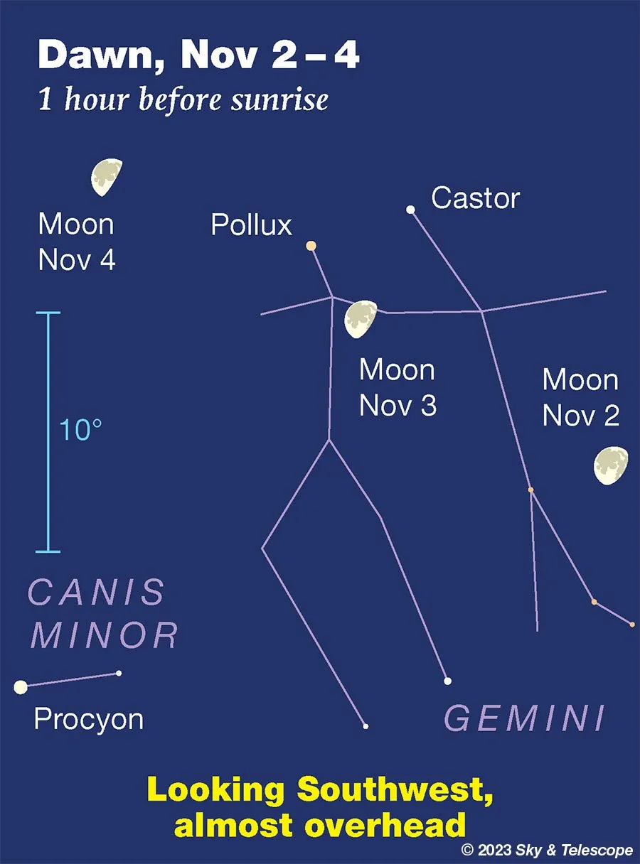 ماه غول پیکر در حال کاهش فاز است و حدود ساعت 9 یا 10 شب طلوع میکند. هنگامی که به ارتفاع مناسبی رسید، میتوانید آن را در کنار ستارههای «سرپیشین» (Castor) و «سرپسین» (Pollux) در سمت چپ و پایین سمت چپ آن ببینید که مانند شکل زیر یک مثلث را تشکیل میدهند. با پیشروی شب و حرکت آرام ماه به سمت پولوکس، این مثلث کوچک میشود.
