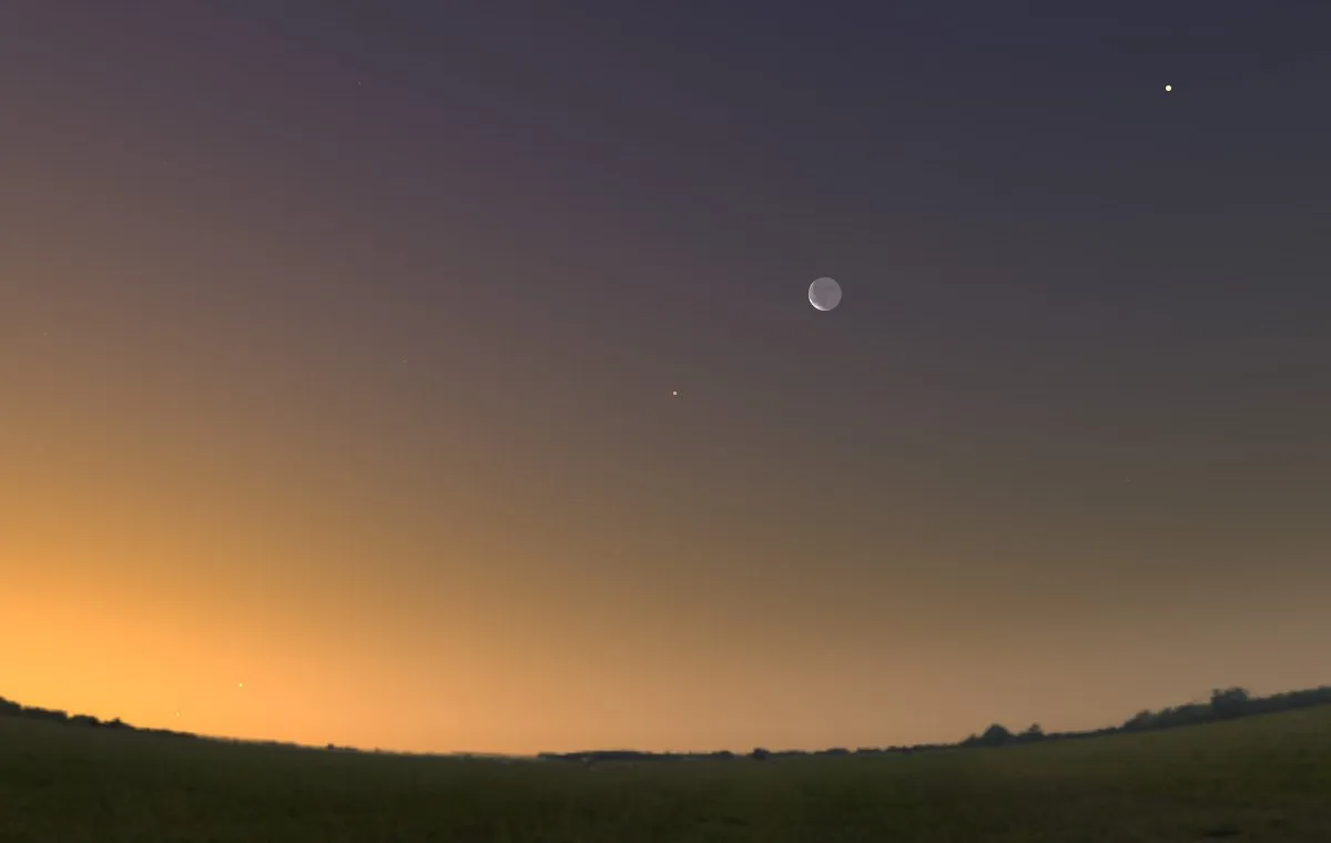 هلال ماه که یک روز از آغاز آن گذشته و در حال افزایش فاز است، به آسمان عصرگاهی بازمی گردد و از دوقلوهای صورت فلکی دوپیکر میگذرد و منظرهای تماشایی میآفریند.