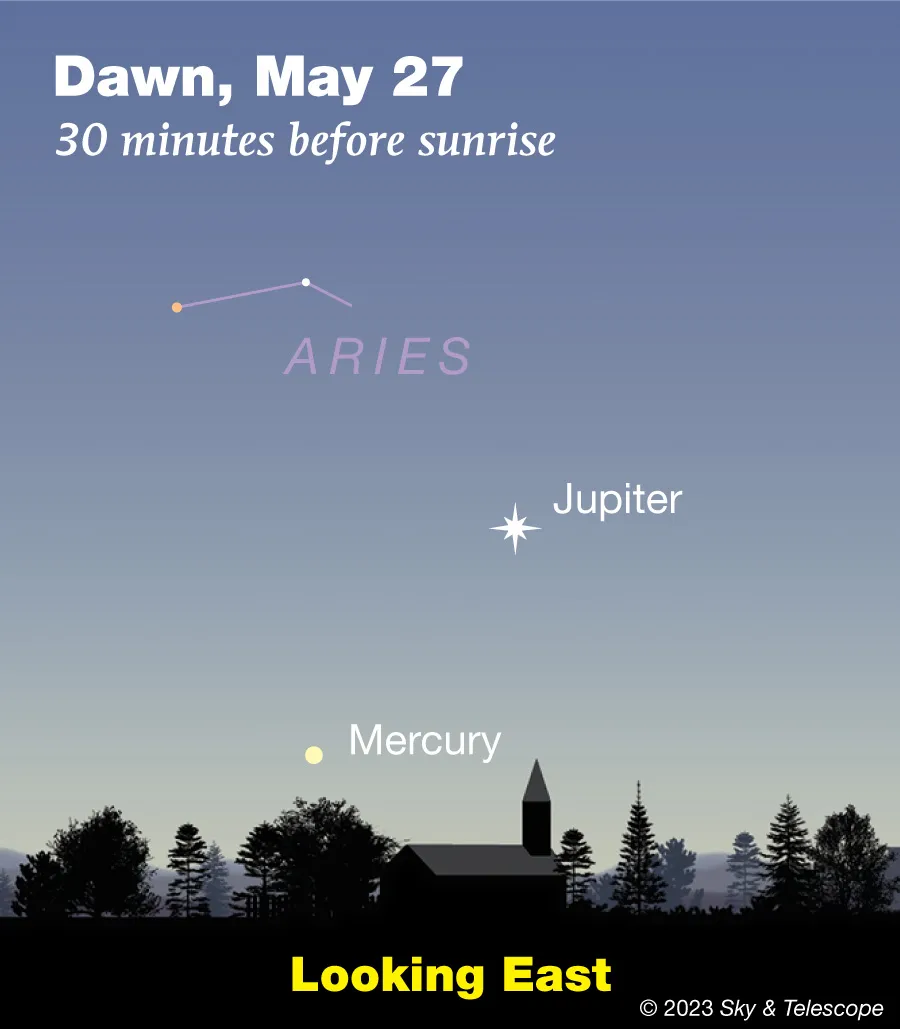 مشتری (Jupiter) با قدر 2.1- در صورت فلکی «حمل» (Aries) و هنگام طلوع خورشید دیده میشود. برای رصد آن حدود 40 دقیقه پیش از طلوع، ارتفاع پایین سمت شرق را نگاه کنید.
