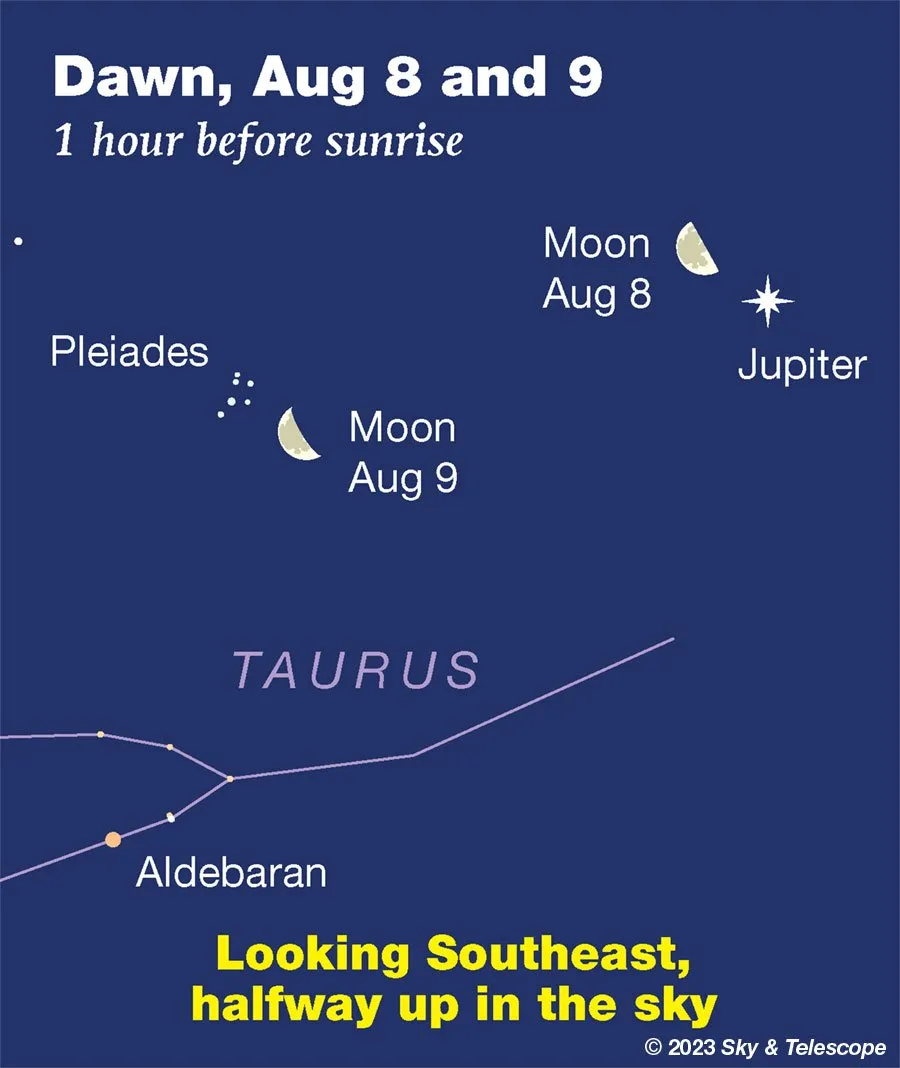 خوشهی زیبای «پروین» (Pleiades) هم در همان نزدیکی حضور دارد تا این منظره را تکمیل کند و بسیار پایینتر از آن، پیش از طلوع خورشید، صورت فلکی «شکارچی» (Orion) شروع به بالا آمدن در آسمان میکند.