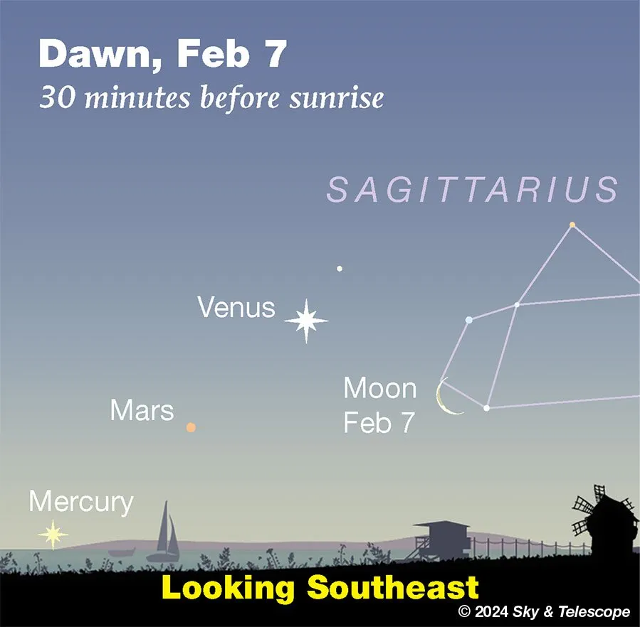در سحرگاه چهارشنبه، زهره و هلال باریک ماه در جنوب شرقی آسمان با ارتفاع کمی رخنمایی میکنند. تماشای مریخ و عطارد اما بسیار چالش برانگیزتر خواهد بود. آنها سمت چپ پایین ناهید قرار گرفتهاند و همانطور که نشان داده شده است، برای رصد آنها به یک افق صاف و ابزار اپتیکی نیاز خواهید داشت.