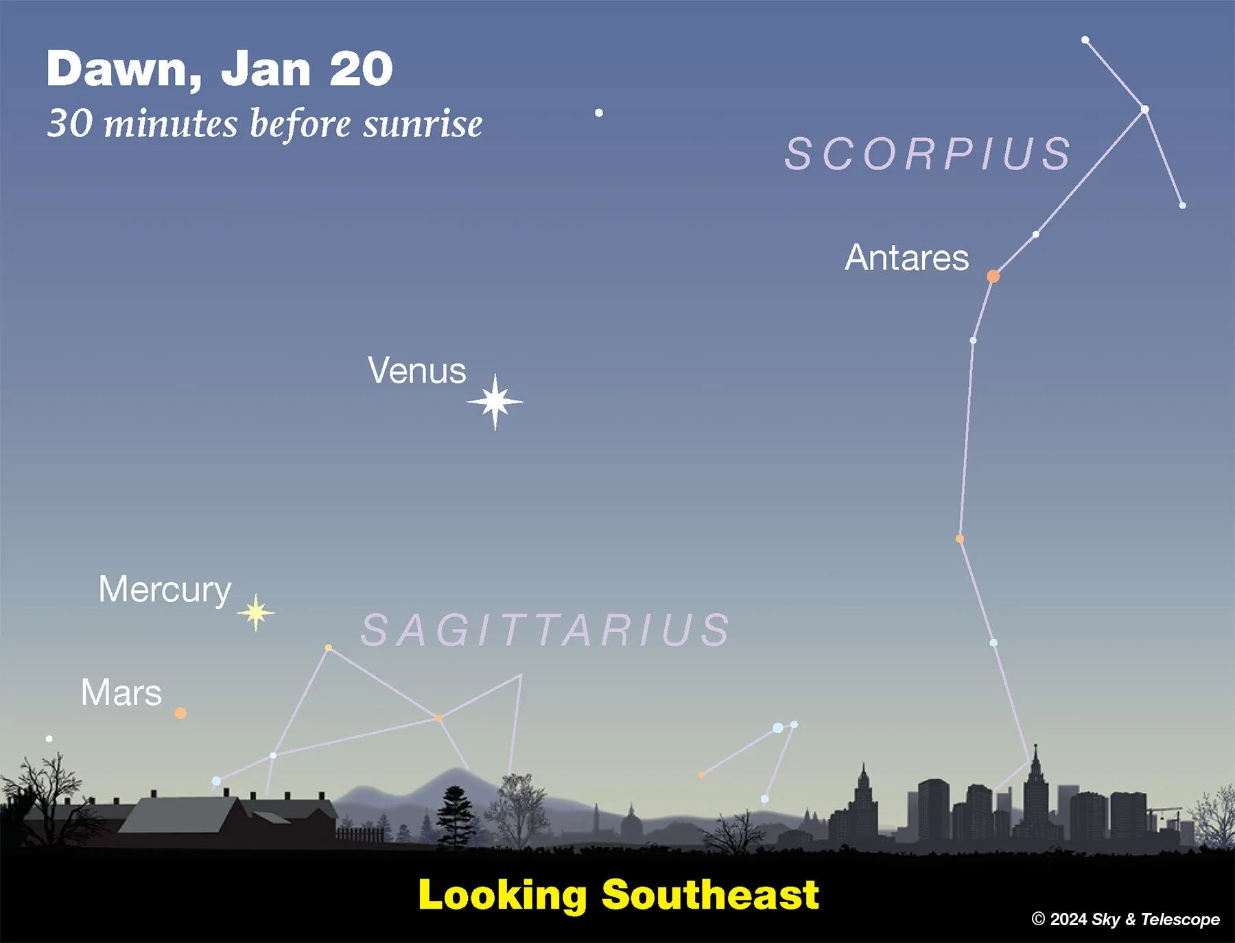 مریخ به رنگ سرخ، در سپیده دم و تنها کمی پیش از طلوع خورشید، با قدر 1.4 پایین سمت چپ عطارد حضور دارد و رصد آن حتی با دوربین دوچشمی کمی دشوار است. با این وجود وضعیت رصدی آن در هفتههای آینده به تدریج بهتر خواهد شد.