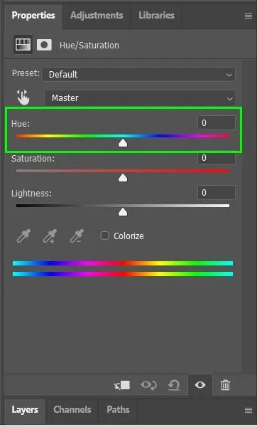 حالا مقدار Hue را تغییر دهید تا رنگ مورد نظرتان را انتخاب کنید. در انتها، مجدداً Saturation را روی همان مقدار ۰ اولیه تنظیم کنید تا همه چیز به حالت عادی بازگردد.