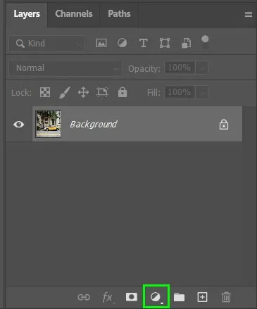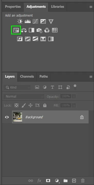 بعد از اینکه محیط موردنظر را انتخاب کردید، یک لایه Adjustment Layer را مطابق شکل زیر به تصویر اضافه میکنیم.