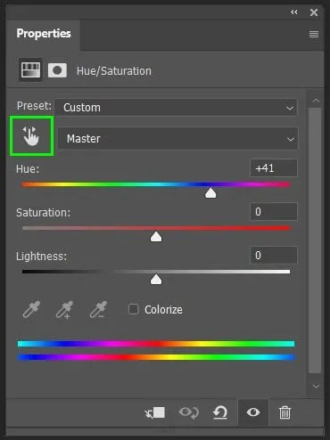 شما همچنین میتوانید آیکن slider که در همین پنجره قرار دارد (عکس زیر) را انتخاب کنید تا با استفاده از آن از طریق کلیک کردن و کشیدن نشانگر موس رو رنگ موردنظر در تصویر، سطوح اشباع رنگی را تغییر دهید. یادتان باشد، هنگام کلید کردن و کشیدن (Drag) روی رنگ تصویر و تنظیم آنها، کلید کنترل (در ویندوز) و کلید Command (در مک) را نگه داشته باشید.
