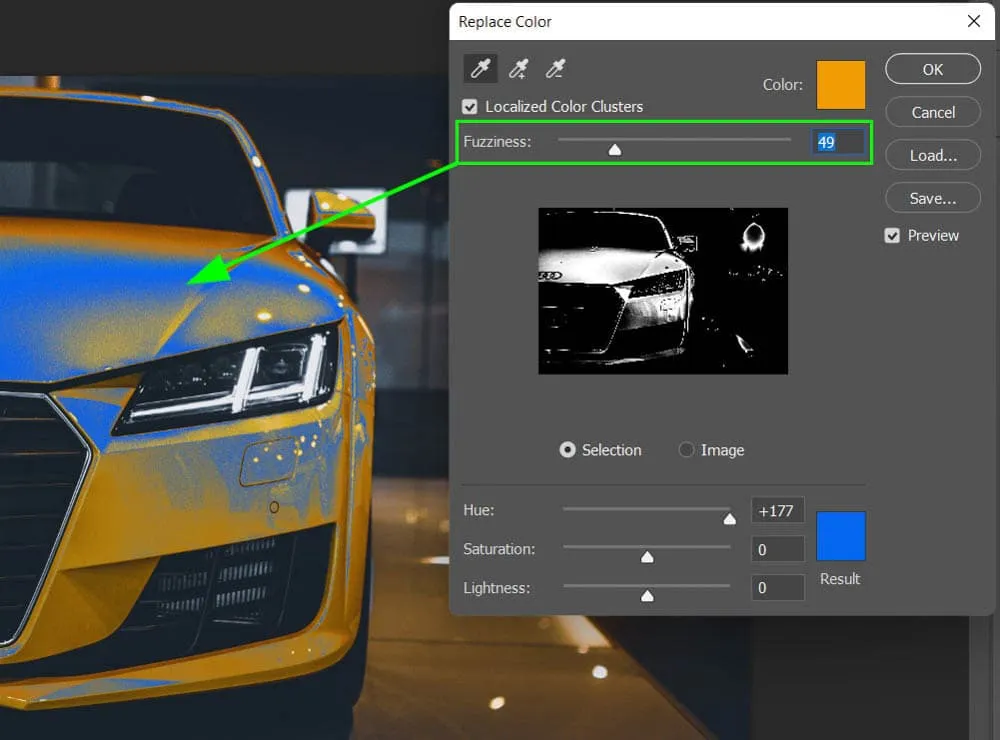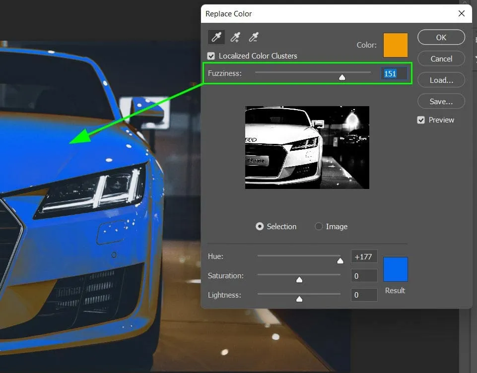 زمانی که رنگ موردنظر را انتخاب کردید، باید مقدار Fuzziness Slider را مشخص کنید. با استفاده از این بخش شما در واقع انتخاب میکنید که دامنه رنگ چقدر باید مشخص و محدود باشد. به عبارت دیگر، انتخاب مقداری کم برای Fuzziness به معنای آن است که تنها رنگهای خیلی شبیه به رنگ موردنظر شما تغییر پیدا میکنند. هرچه این مقدار بالاتر باشد، رنگهایی که شباهت کمتری با رنگ انتخابی دارند (پردههای رنگی مختلف) نیز دستخوش تغییر خواهند شد.