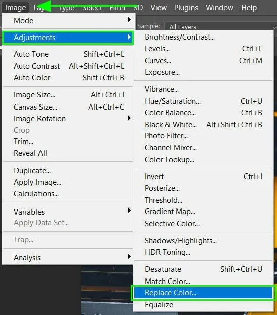 بعد از اینکه لایه جدید را در مرحلهی قبل ساختید، آن را انتخاب کنید. حالا مسیر زیر را پیش بگیرید Image > Adjustments > Replace Color
