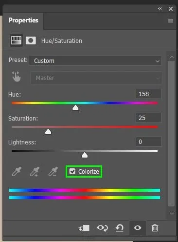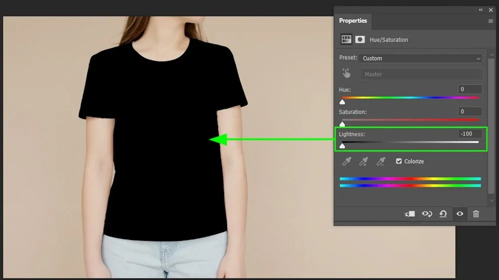 مطابق عکس زیر، تیک گزینهی Colorize را فعال کنید. حالا از این نشانگرها برای تنظیم رنگ و نور مورد نظر خودتان استفاده کنید. اگر قصد دارید که رنگ مشکی را برای تصویر خود انتخاب کنید، باید مقدار Lightenss را روی -۱۰۰ تنظیم کنید.