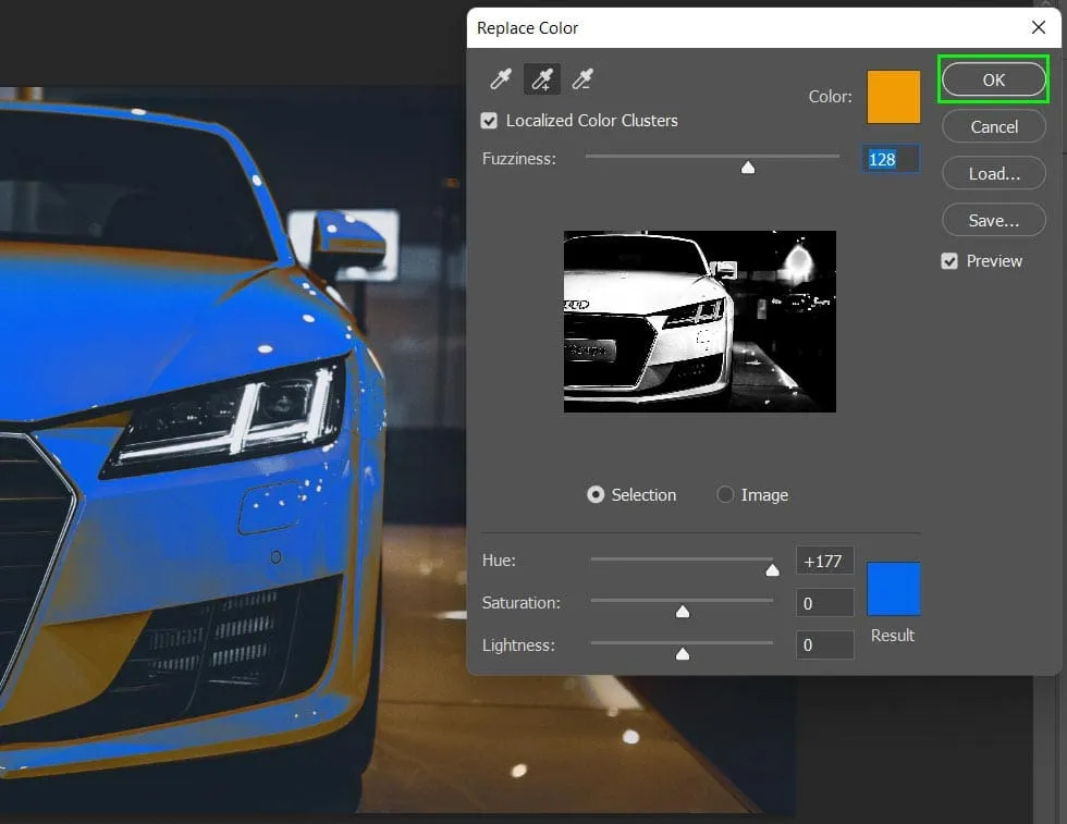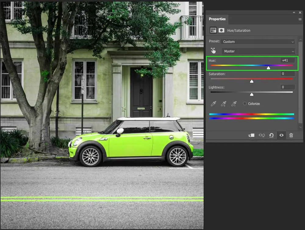در مثال ما، از آنجایی که رنگ نواحی اطراف ماشین هم دستخوشش تغییر شده، شما میتوانید با استفاده از همان ویژگی Layer Mask، رنگها بخشهای اضافی و یا ناخواسته را پاک کنید. ولی یادتان باشد، در این روش دیگر احتیاجی به ایجاد یک Layer Mask نیست. چراکه Adjustment Layer به صورت خودکار خودش یک ماسک دارد و از همان میتوان استفاده کرد. این موضوع را در بخش بعدی توضیح میدهیم.