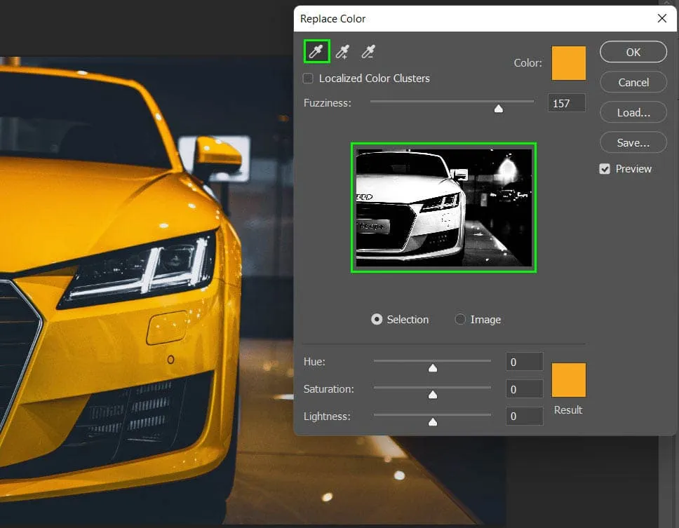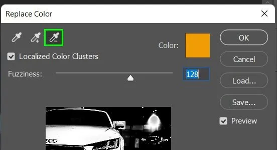 حالا پنجره جدیدی باز خواهد شد. در داخل پنجرهی Replace Color، از ابزار قطره چکان استفاده کرده و رنگی که قصد تغییر دادن آن دارید را انتخاب کنید. اگر تصویر شما شامل پردههای رنگی مختلفی از همان رنگ مورد نظر میشود، توصیه ما این است که پررنگترین بخش آن را انتخاب کنید. پنجرهی Preview (پیشنمایش) نیز بخشهایی از تصویر که به رنگ انتخابی شما هستند را به شما نمایش خواهد داد.