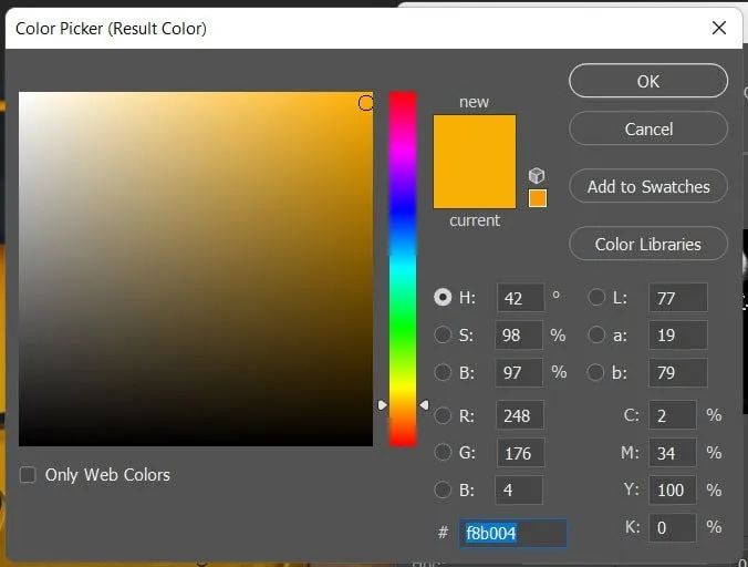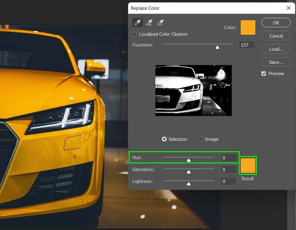 در بخش پایینی همین پنجره، میتوانید نشانگرهای موجود را تغییر داده و رنگ جدید مورد نظرتان را انتخاب کنید. شما همچنین میتوانید روی بلوک رنگی به اسم Result نیز کلیک کرده تا صفحه انتخاب رنگ فتوشاپ برای شما باز شود و رنگ جدید موردنظر را راحتتر انتخاب کنید.
