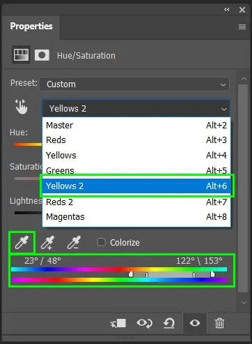 اگر میخواهید کنترل بیشتری روی رنگهایی خاص داشته باشید، در همان پنل Adjustment Layer، بخشی که در تصویر زیر میبینید را باز کنید و کانال رنگی موردنظرتان را انتخاب کنید. شما همچنین میتوانید روی آیکن قطره چکان کلیک کرده و از آن نیز برای انتخاب رنگ مورد نظرتان استفاده کنید. زمانی که رنگ مورد نظر انتخاب شد، حالا میتوانید از اسلایدرهای موجود استفاده کرده و آن را تغییر دهید.
