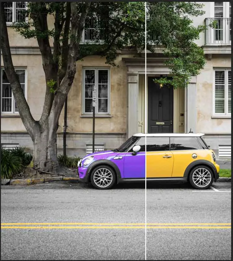 زمانی که رنگ تمام بخشها را به حالت عادی بازگرداندیم، دکمههای Control + D را بفشارید تا تمام هاشورهای بخشهای انتخاب شده ناپدید شوند. همانطور که مشاهده میکنید، تمام بخشهای عکس دستنخورده باقیمانده و تنها رنگ ماشین تغییر کرده است.