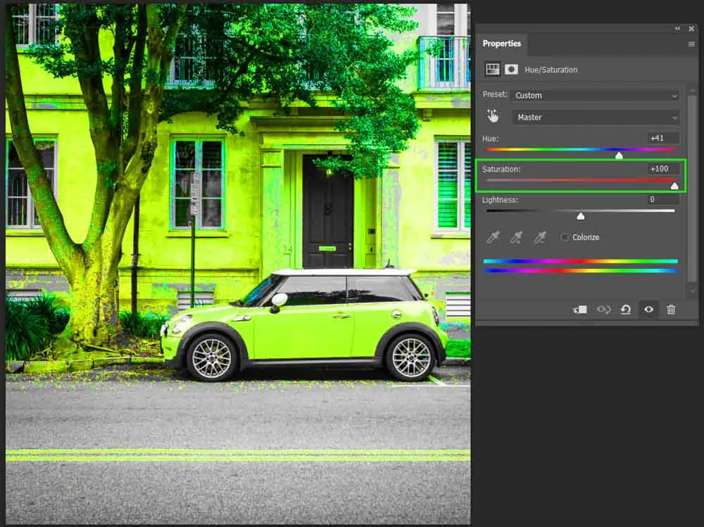اگر قصد دارید تا رنگ تصاویر را با استفاده از این روش تغییر دهید، همانند عکس زیر، مقدار Saturation را روی +۱۰۰ تنظیم کنید تا به راحتی متوجه شوید چه رنگهایی را تغییر میدهید.