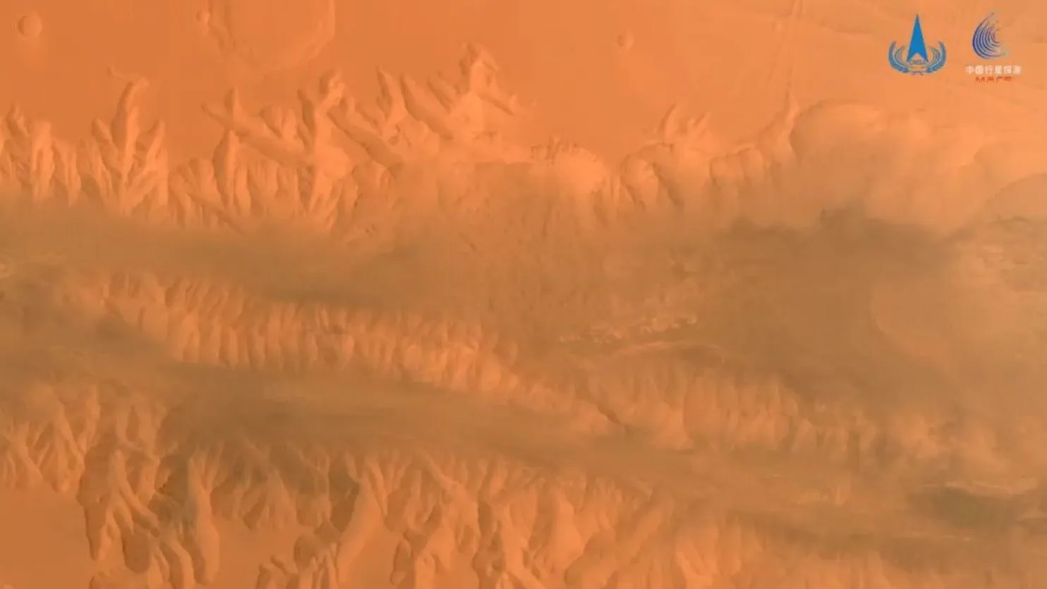 در همین حال که مریخنورد روی سطح را میکاود، در مدار مریخ، فضاپیمای تیانون-1 که ژرونگ را در سفر هفت ماهه از زمین به مریخ حمل میکرد، از بالا به کار خود ادامه میدهد. یکی از مأموریتهای این مدارگرد ثبت تصاویر چشمنواز از سیارهی سرخ است. برای نمونه دوربین وضوح متوسط کاوشگر، در 1 آوریل (12 فروردین) از منطقهی معروف «دره مارینر» (Valles Marineris) گرفت و دوربین وضوح بالای آن، در 17 آوریل (28 فروردین) عکسی از «دهانهی تریولت» (Triolet Crater) تصویر کرد.