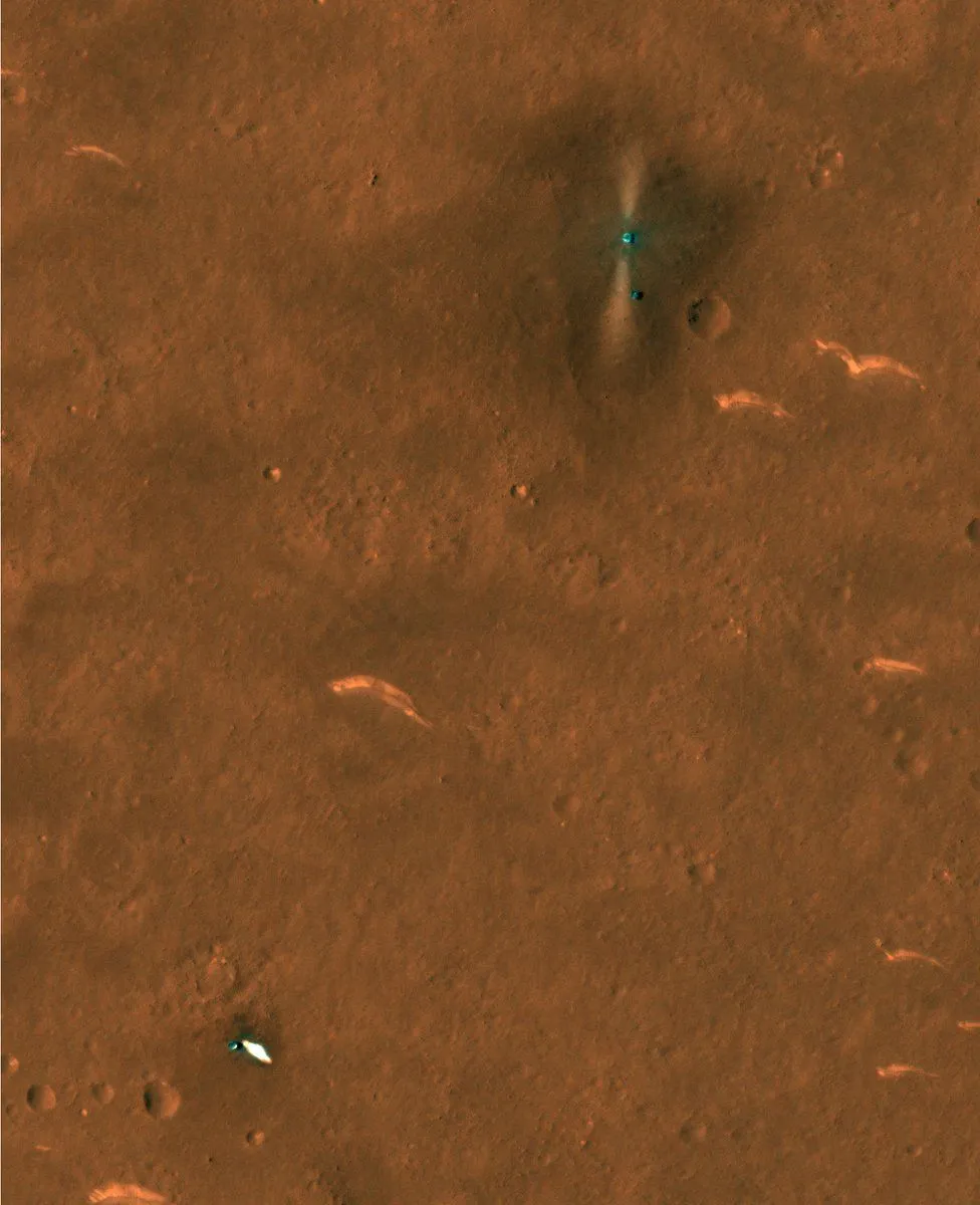 مدارگرد تیانون-1 هم که پیش از این سطحنشین و مریخنورد از آن جدا شده بودند، در 2 ژوئن (12 خرداد) از بالا به دو همراه خود در این سفر نگاه کرده است. در عکس این مدارگرد که در طیف سیاه و سفید گرفته شده هر دو کاوشگر به صورت مجزا دیده میشوند.
