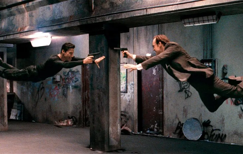نئو (کیانو ریوز) در برابر مأمور اسمیت (هوگو ویوینگ) در ماتریکس (The Matrix)